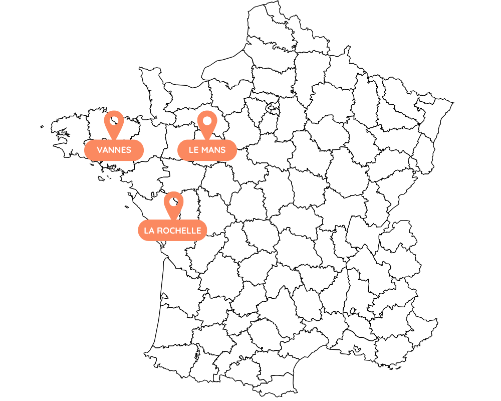Basée dans la Sarthe, j’accompagne les entreprises au Mans, mais aussi à La Rochelle et à Vannes, des territoires que je connais particulièrement bien.